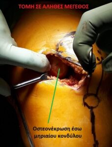Το γόνατο είναι μια άρθρωση τριών διαμερισμάτων: το έσω διαμέρισμα, που δέχεται και τα περισσότερα φορτία, το έξω και σχετικά πιο ελεύθερο διαμέρισμα, που δέχεται λιγότερα φορτία και το διαμέρισμα της επιγονατιδομηριαίας άρθρωσης. Το τελευταίο, επίσης δέχεται σημαντικά φορτία, λόγω της συμμετοχής του στον εκτατικό μηχανισμό. Όπως είδαμε, η  οστεοαρθρίτιδα ή εκφυλιστική ή πρωτοπαθής αρθρίτιδα ή απλά αρθρίτιδα, είναι μια συχνή κατάσταση. Για λόγους μηχανικούς, η αρθρίτιδα του γόνατος σε ένα ποσοστό πάνω από 90% ξεκινά από την έσω πλευρά της άρθρωσης. Η αρθρίτιδα λοιπόν, αρχικά προσβάλει το χόνδρο που καλύπτει τις αρθρικές επιφάνειες του έσω κονδύλου του μηρού  και του έσω κονδύλου της κνήμης. (εικόνα 1 ) .Η φθορά προκαλεί λέπτυνση, τράχυνση των επιφανειών και αυξημένη  τριβή. Συχνά συνυπάρχει εκφυλιστική ρήξη του έσω μηνίσκου.