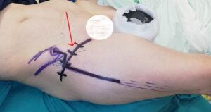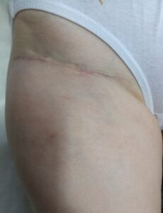Όπως αναφέρθηκε η AMIS πραγματοποιείται μέσω μιας μικρής πρόσθιας τομής. Εναλλακτικά μπορεί να πραγματοποιηθεί με μια τομή επί της δερματικής πτυχής του βουβώνα. Αυτή, ακριβώς επειδή βρίσκεται περίπου στην περιοχή που αντιστοιχεί στο λάστιχο του εσωρούχου, αναφέρεται διεθνώς με τον όρο “τομή μπικίνι” (hip bikini incision). (εικόνα 11 και εικόνα 12 ) Πέρα από το προφανές αισθητικό πλεονέκτημα, θεωρητικά υπερτερεί στην επούλωση του τραύματος. Ανεξάρτητα από την επιλογή κλασσικής μικρής πρόσθιας ή “μπικίνι” τομής, η εγχειρητική διαδρομή μέχρι την άρθρωση του ισχίου γίνεται διαμέσου μυών δύο διαδοχικών στρωμάτων. Οι αποκολλήσεις είναι ελάχιστες, ενώ ολόκληρη η πρόσθια προσπέλαση σέβεται απόλυτα και αφήνει ανέπαφους συνδέσμους και τένοντες. Είναι χαρακτηριστικό ότι η απώλεια αίματος μετά από αρθροπλαστική ισχίου με τη μέθοδο AMIS είναι πολύ μικρή, ειδικά αν η τεχνική γίνει με μοντέρνα αναισθησιολογικά πρωτόκολλα. Μελέτες με χρήση μαγνητικής τομογραφίας ένα χρόνο μετά την επέμβαση αποδεικνύουν ότι η τεχνική αυτή πρακτικά δεν αφήνει κανένα «ίχνος» δηλαδή καμία βλάβη στους μυϊκούς ιστούς που περιβάλουν το ισχίο.
